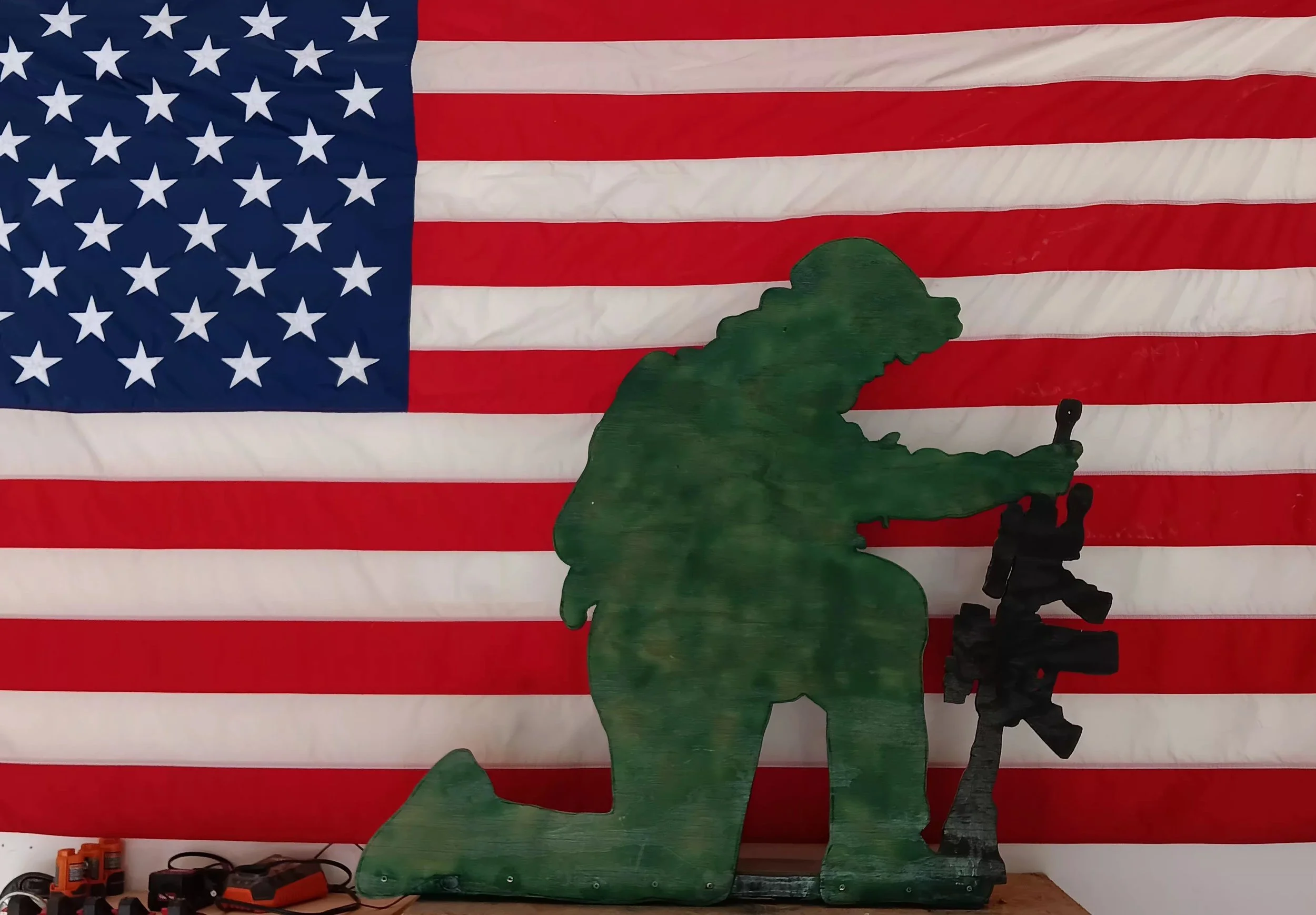 I made this out of a whim. We are a big military family and I wanted something to represent us on holidays like Memorial day, Veterans day and Christmas. This is a life size kneeling soldier where we place on the lawn.